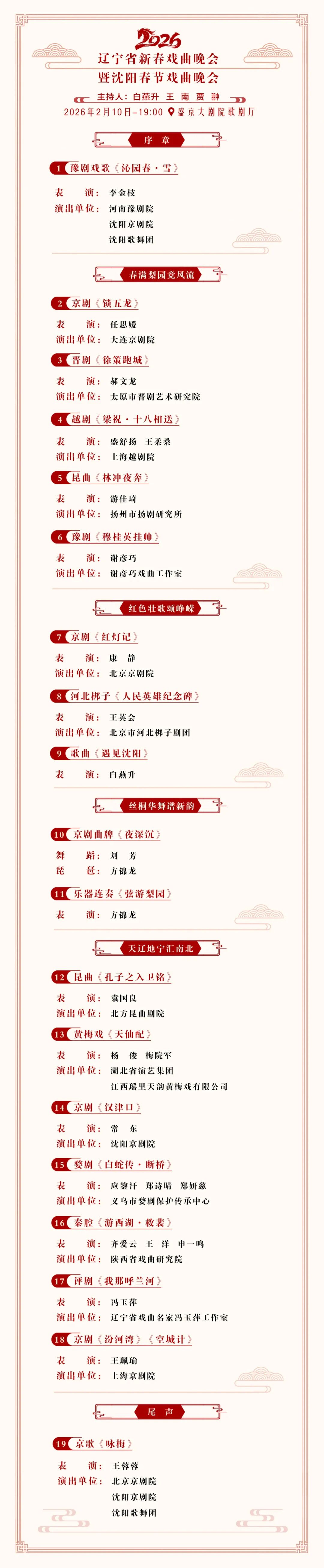 2026年是“十五五”开局之年,新的壮阔征程已经开启。在此背景下,本次晚会邀请了包括辽宁多个剧种在内的全国十五个剧种的五十多位名家和青年领军,共唱幸福歌,共庆中国年,以文化展形象、聚人心、增力量,祝福沈阳,祝福辽宁,祝福伟大祖国。