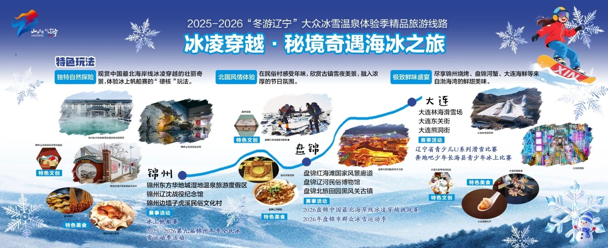 线路涵盖专业雪场竞速、海岸冰凌奇观、古城温泉休闲、冰雪民俗体验及特色美食品鉴等多重维度,融合运动激情、身心疗愈、文化寻味与舌尖盛宴,全面呈现辽宁冬季旅游的丰富层次与热络氛围,为游客打造可畅玩、可放松、可回味的多感冬旅体验。