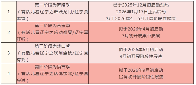 据悉,“乐享四季·有活儿看辽宁”活动以年度为周期,按照舞蹈、音乐、戏曲、语言四大艺术门类分阶段推进。