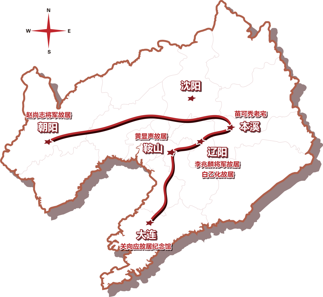 线路节点:苗可秀老宅—李兆麟将军故居—白乙化故居—黄显声故居—关向应故居纪念馆—赵尚志将军故居